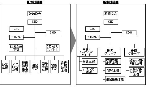 平成18年10月1日付けで、従来の本部制に加え、新たにグループ管理体制を導入しました。これにより情報共有の効率化を図り、意思決定スピードの向上を目指します。具体的には「営業・マーケティンググループ」、「開発グループ」、及び「管理グループ」を新設し、これら3グループに各本部を集約しました。また、今後の世界市場での競争力強化のために当社が現在積極的に推進中のグローバル化の一環としても、この度の組織再編はグローバル企業グループとしての事業の推進と管理の効率化を図るものであります。