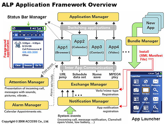 本アプリケーション・フレームワークは、ACCESSのモバイル市場向けプラットフォームである「ACCESS Linux Platform™」の一部として開発されました。ACCESSのアプリケーション・フレームワークは、アプリケーションをインストールしたり、管理するための機能を提供するのに加えて、アプリケーション間の通信、たとえば、音楽再生、メッセージング、その他の高度な機能をシームレスに切り替える機能を提供します。また、電話機の機能の不正な利用や、重要なシステム・データへの不法アクセスを防ぐために、アプリケーションの安全性を確保できるように設計されています。