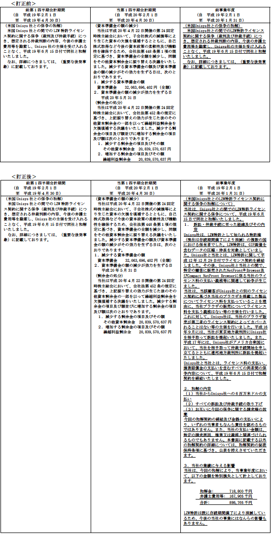 株式会社ACCESS(本社:東京都千代田区、代表取締役社長:荒川 亨、以下当社)は、平成20年6月12 日に発表いたしました「平成21年1月期 第1四半期財務・業績の概況」に関して、一部誤りがございましたので、下記の通り追加・訂正いたします。なお、追加・訂正は下線を引いた部分となり、数値データについて訂正はございません。