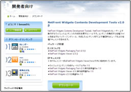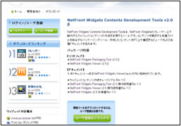 ウィジェットコンテンツ開発ツールは、日本語PC版「NetFront Widgets」コミュニティサイトにアクセスし、ユーザ登録することで、ダウンロードできます。また、ウィジェットコンテンツ開発ツールで制作した「ウィルコム ガジェット」用のウィジェットコンテンツは、「NetFront Widgets」コミュニティサイト上で公開することができます。