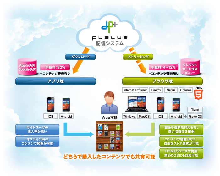 「PUBLUS 」を採用いただくことにより、事業者は、iOSおよびAndroid対応のアプリケーション版と、PCも含めたマルチプラットフォームに対応できるブラウザ版を融合したハイブリッドの電子書籍配信サービスをユーザへ提供することが可能になります(下図参照)。