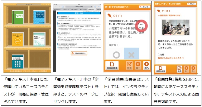 新サービスでは、テキストは、EPUB 3対応の電子書籍として提供され、スマートフォン、タブレットなど、あらゆる端末のブラウザ上で利用できるようになります。また、教材の閲覧のみでなく、動画視聴や練習問題への回答といったインタラクティブな学びを実現しています。さらに、各受講者の電子教材は、クラウドにより各自の本棚に格納・管理・同期されており、しおり機能を使って、受講者は、問題集の途中からでも任意のテキストを選んで、自宅のPCや、移動中のスマートフォンから、空き時間を使ってサービスを利用することが出来ます。