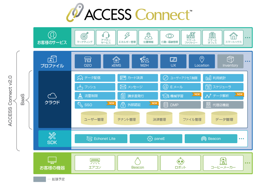 「ACCESS Connect」のうち、「O2O」、「Location」、「UX」の各プロファイルは、スマートフォンアプリ、クラウドサービスに、BLE搭載の多彩なBeaconデバイスを連携させることにより、サービス事業者の“O2O”や”見守り”“消費材発注”といった、人やモノの位置情報に連動した革新的なサービスの開発を迅速に実現するソリューションです。ACCESSは、「ACCESS Connect」のBaaS、各プロファイルのSDK、Beaconデバイスを「Linking」のインターフェースに対応させることにより、事業者の、より汎用性の高いIoTサービスの開発を支援し、本格的なIoT社会の到来を加速させてまいります。
