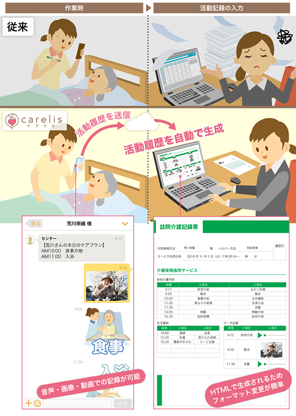 また、スタンプや文字のみで伝えることが難しい要介護者の日々の表情なども音声・画像・動画で簡単に記録し、共有することが可能です。ケアリスを活用することにより、要介護者、家族と介護職員間のコミュニケーションをより豊かに、かつ簡単・迅速にし、介護現場の業務効率向上やサービスの質の向上を支援します。
