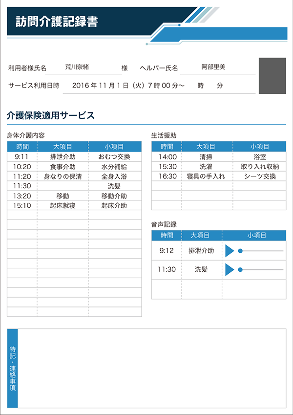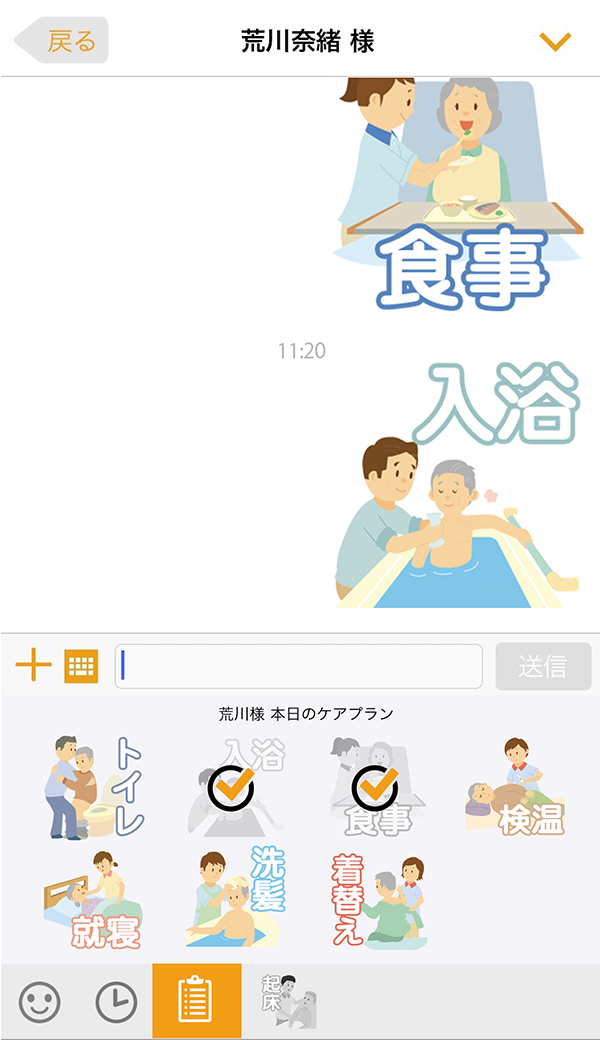 「ケアリス」は、豊富な市場実績を誇るACCESSのビジネス向けチャットサービス「Linkit®(リンキット)」をベースに開発しており、スマートフォンやタブレットを用いてチャットのスタンプを押す要領で、活動履歴を簡単に自動生成する仕組みを提供します。介護職員は、入浴・食事といった介護作業に対して、その場で専用スタンプを押すだけで、リアルタイムに日時、担当者、介護者、介護作業といったデータがクラウドに送信され、介護記録書が生成されます。