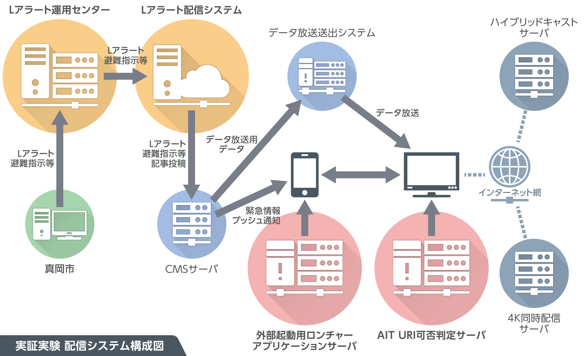 | 1st Media | Lアラート配信サーバと連動しLアラート情報をプッシュ通知するスマートフォンアプリの提供及び、ハイコネXと連動する仕組みの開発。 |