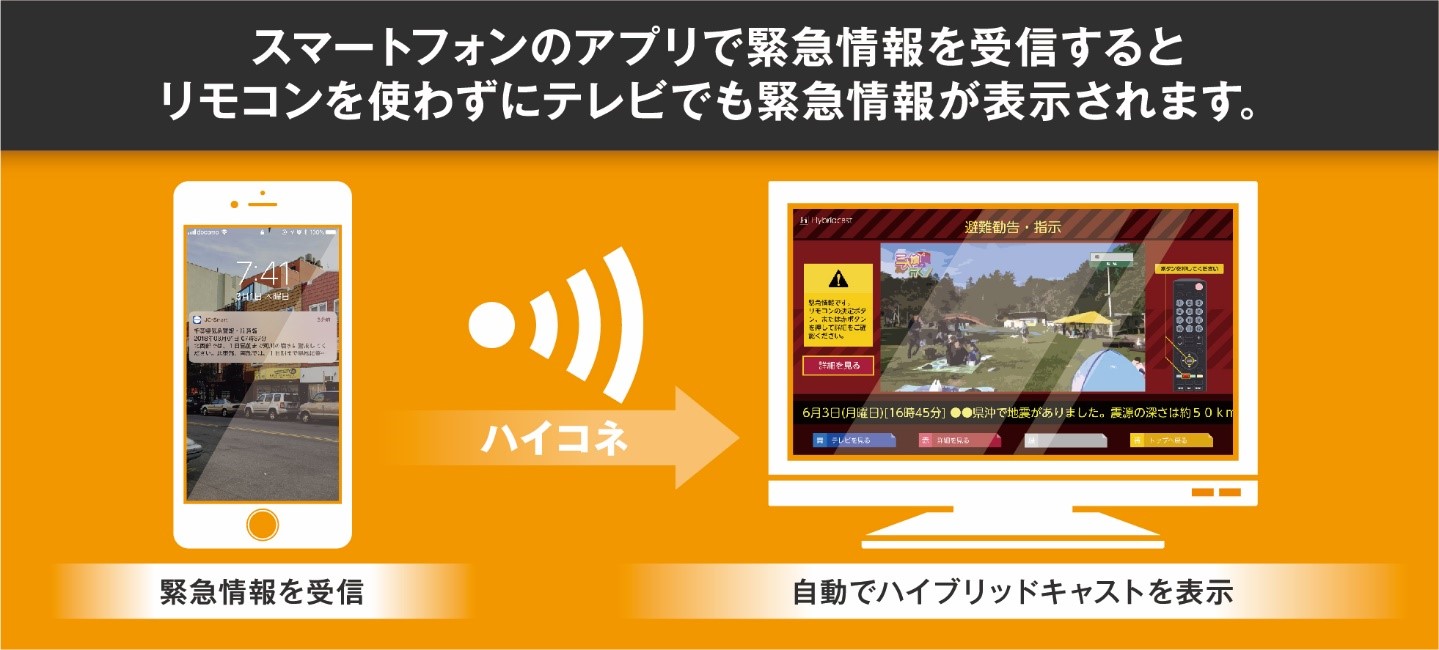 今回は、2019年9月1日の砺波市総合防災訓練高波会場で、緊急情報をスマートフォンへPUSH通信し、テレビが情報を受信すると、リモコンを使わずに自動的に起動し、ハイブリッドキャスト※1で緊急情報が表示されるようします。