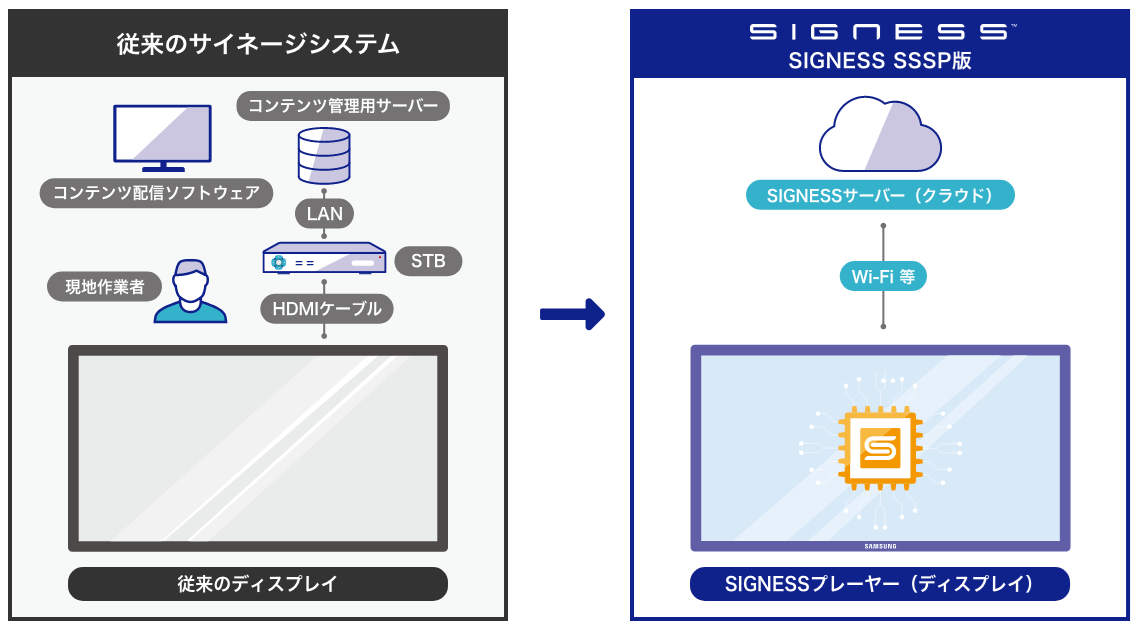 一般にサイネージシステムを構築する場合、ディスプレイとSTBをそれぞれ購入し、さらに任意のサイネージサービス(ASP)に申し込む必要があります。この度のSSSP対応「SIGNESS」とサムスン製スマートディスプレイはACCESSよりすべてワンストップで提供されますので、顧客企業側での複雑なソフトウェア設定や、STBの調達・複雑な配線・保守は不要となり、省スペース、低コストで、簡単便利に、世界品質のディスプレイを用いた本格的なサイネージサービスをすぐに利用開始することが可能になります。