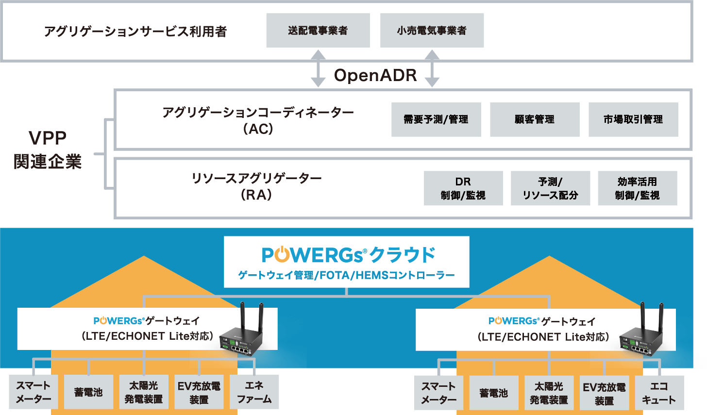 「POWERGs」は、HEMS重点8機器※1 をはじめとする再生可能エネルギー機器から電力データを収集するゲートウェイ、通信インフラ、クラウド管理サービス、運用サポートまでをワンストップで提供することで、エネマネ事業者のサービスの市場投入を迅速化し、開発・運用コストを削減するソリューションです。太陽光発電や蓄電池、電気自動車(EV)等の電力使用量や発電量、充放電量といった電力データを見える化し管理することで、再生可能エネルギーの利用を最適化し、省エネの実現を支援します。各機器の電力データを集約するゲートウェイには、株式会社NTTドコモおよびNTTコミュニケーションズ株式会社が連携して提供するLTE回線(SIM)/ECHONET Lite対応ゲートウェイ「R2100-4L-ACS」を採用し、高品質の通信機能を実現しています。既に「POWERGs」を採用した複数のエネマネサービスの実証実験が進んでいます。