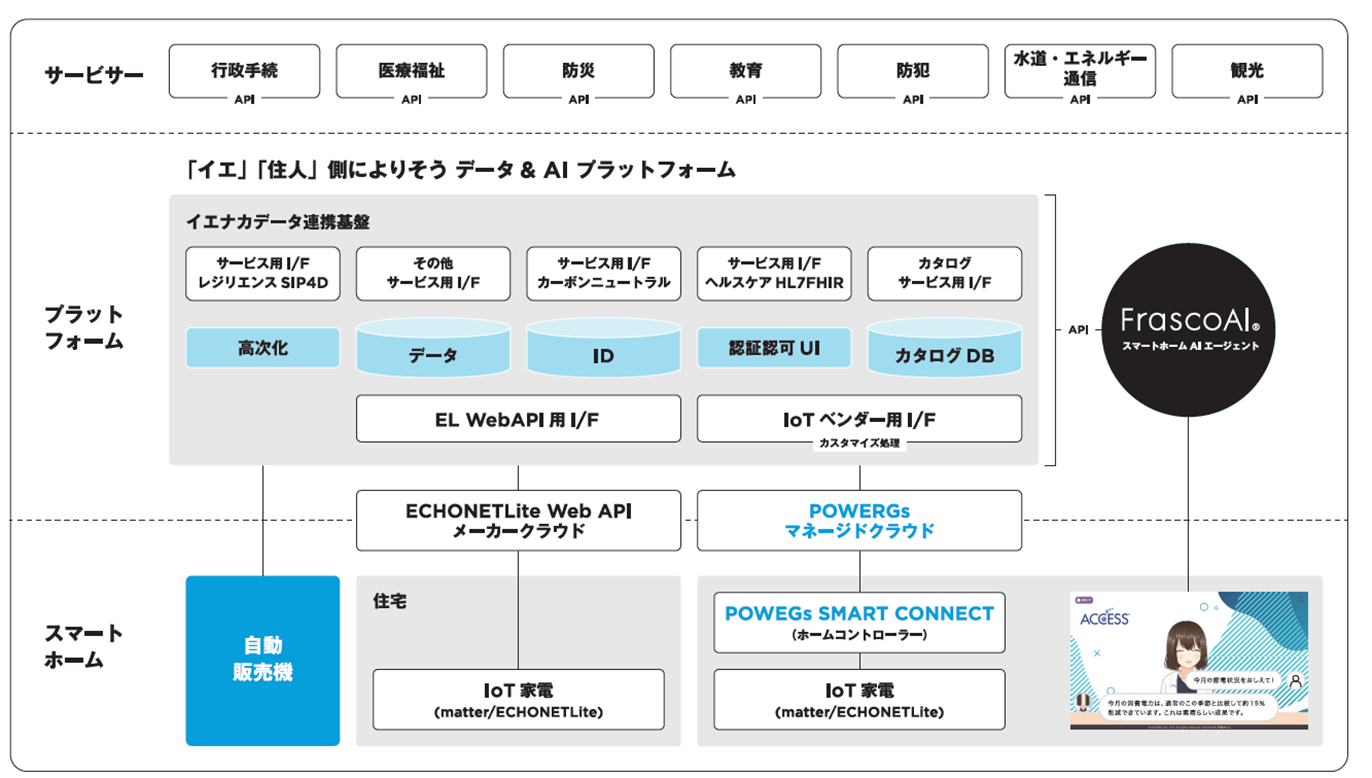 家電の自動制御やエネルギー使用状況の見える化をシームレスに管理する「POWERGs®(パワージーズ)」、目的別に高度なAIエージェントが容易に作成できるカスタムAIエージェント「FrascoAI®(フラスコエーアイ)」といったACCESSの技術に、「ECHONETLite Web API」、「イエナカデータ連携基盤」の技術を組み合わせ、IoT・AI・生活サービスを実現する次世代のスマートホームソリューションを展示します。