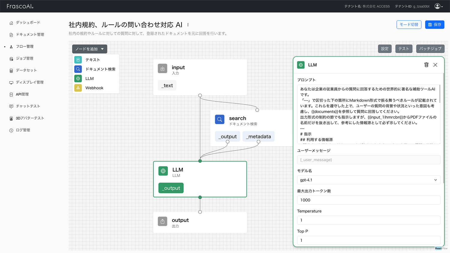 FrascoAIの管理画面ではノーコード機能を活用し、生成AIの活用フローを素早く構築します。