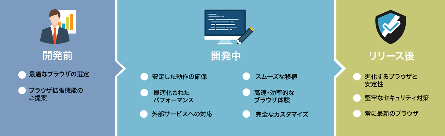 貴社のニーズに合わせてChromium/WebKitやそのバージョン等、最適なブラウザエンジンをご提案いたします。